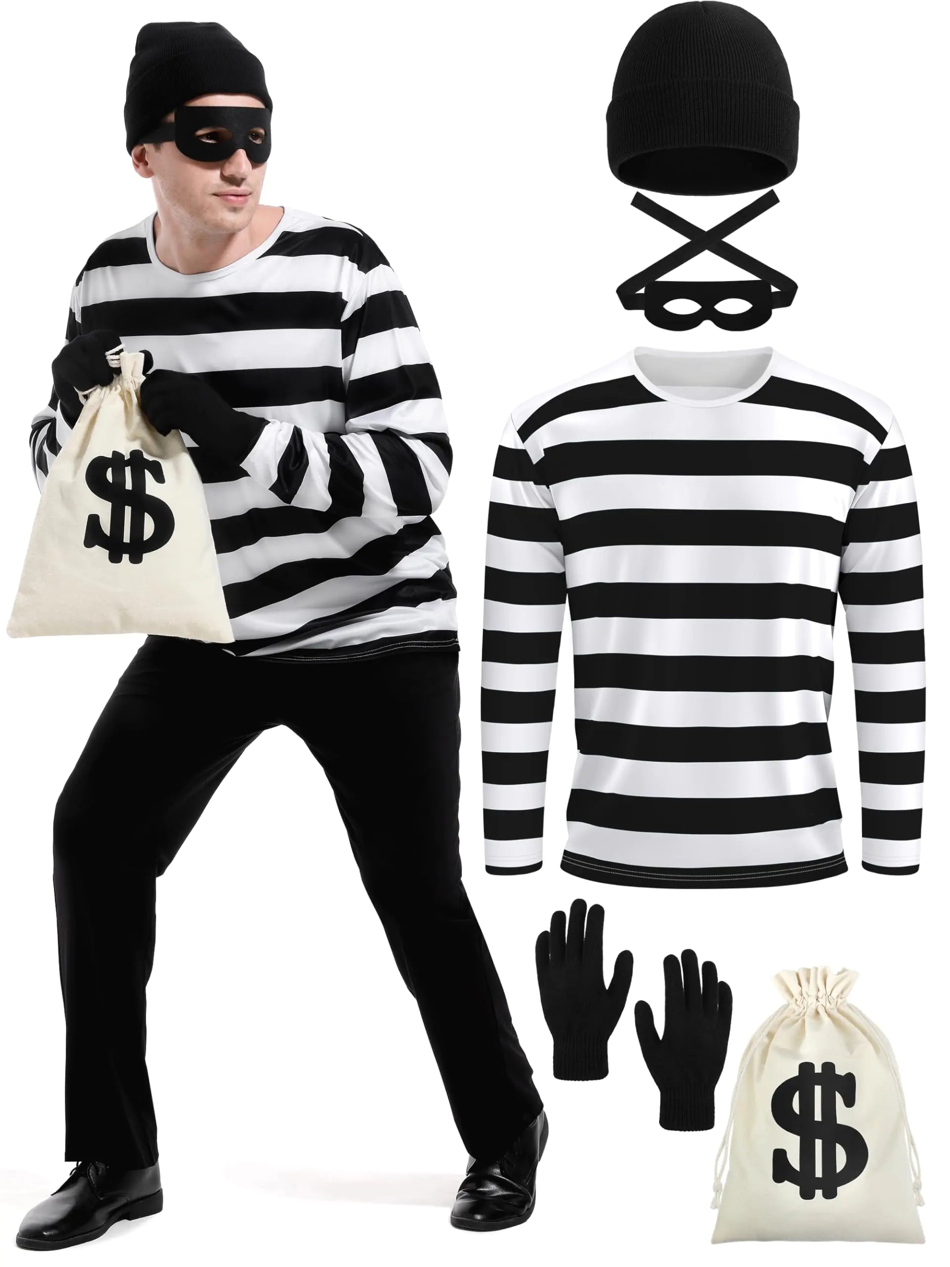 [Halloween costume set includes: 1 black and white striped long-sleeved shirt 1 beanie hat 1 pair of eye masks and black gloves 1 canvas money bag with drawstring closure Black and white striped shirt for men: crafted from stretchy polyester material with its classic black and white striped design providing a comfortable and stylish fit Burglar costumes accessories for cosplay: the hat bag eye masks and gloves are made of stretchy materials including acrylic felt and canvas to ensure a long-lasting use Adult robber costume: whether you want to dress up for a Halloween party cosplay event theme party or even as a basic tops for daily wear our bandit costume can meet all your needs. Halloween costumes for men: from the striped design to the pattern printed on the surface of bag every aspect of the bank robber costume is carefully crafted for a complete look]